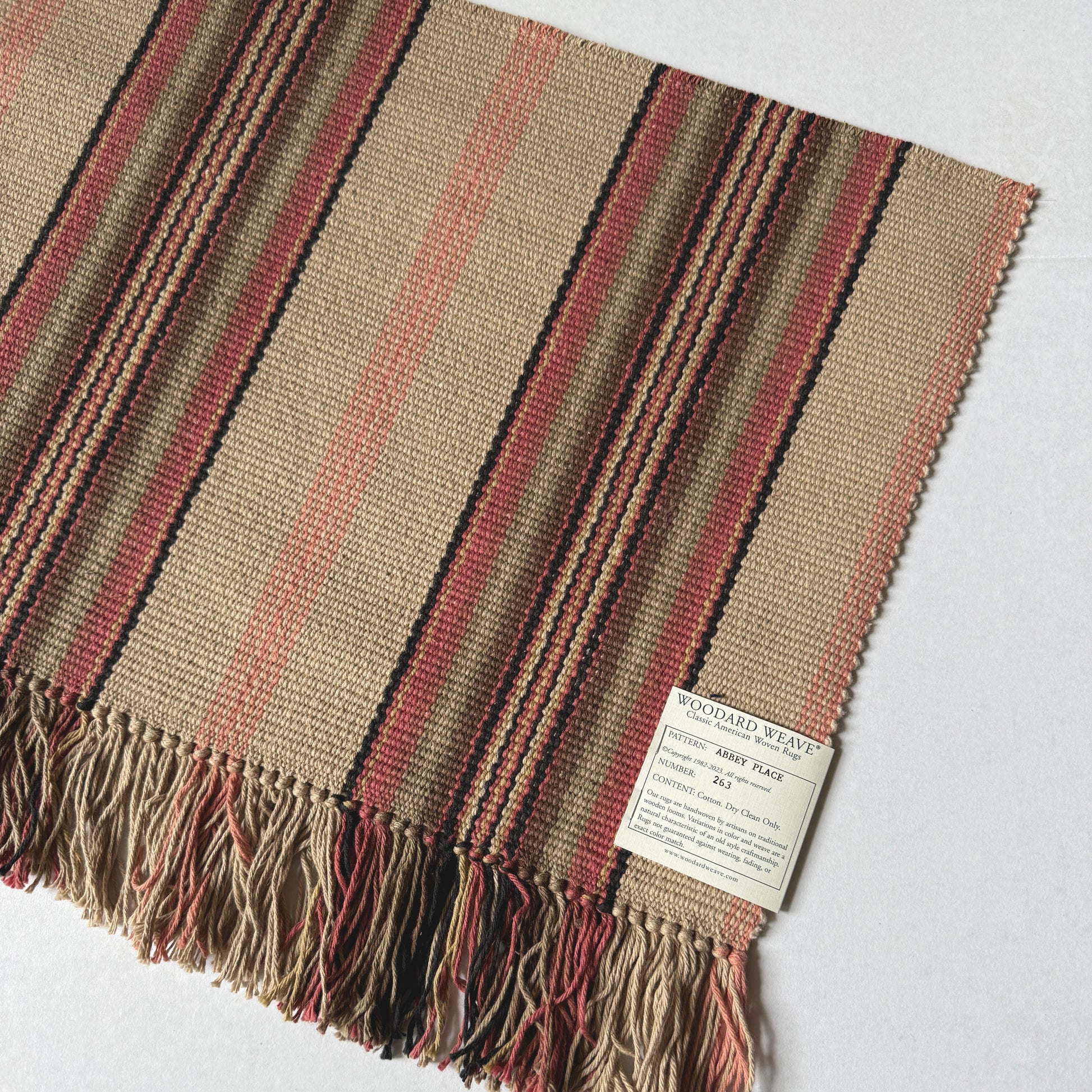 Abbey Place #263 - Salmon, sage, cocoa, brown stripes on tan background.