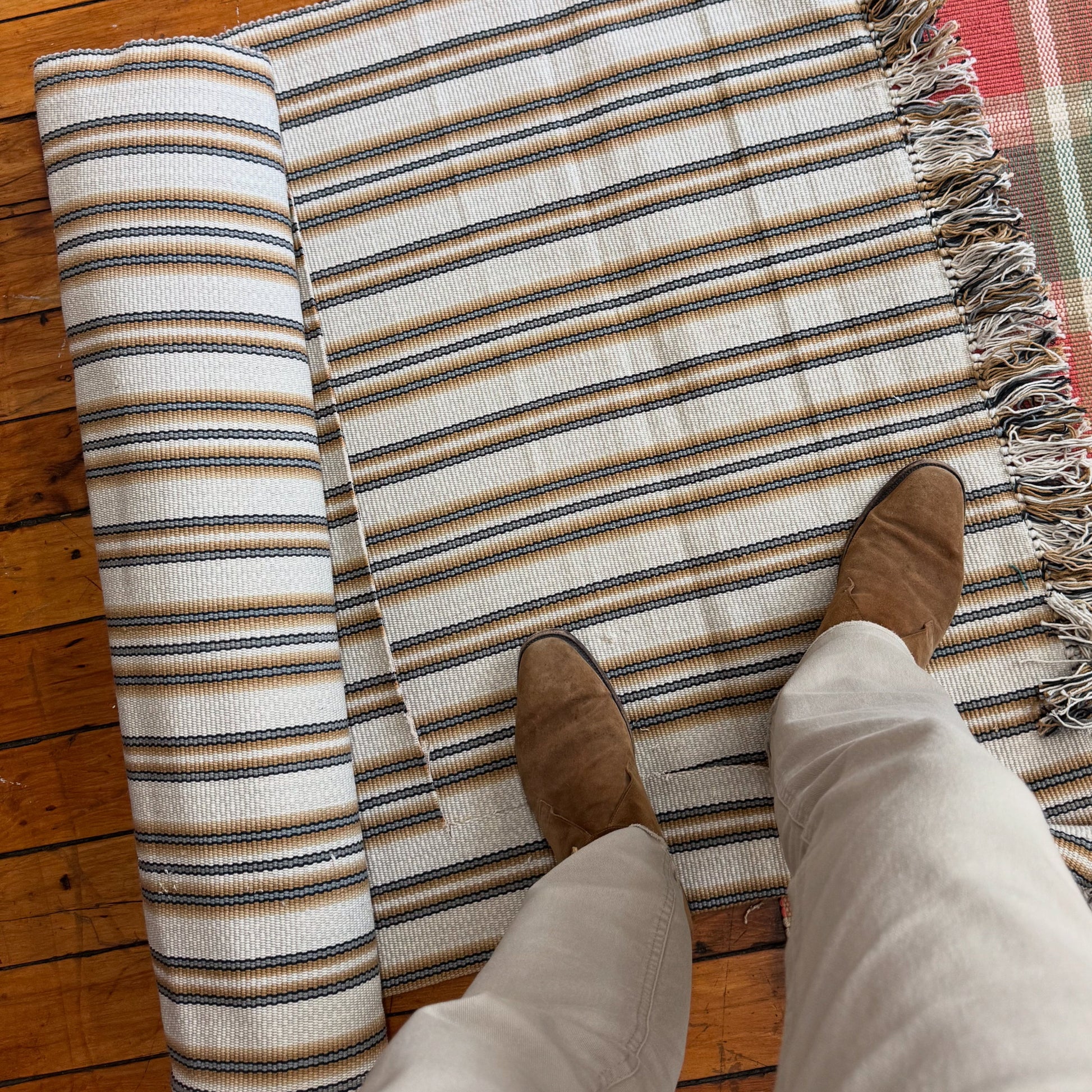 All rugs purchased online are hand finished with fringe on two ends. Custom rugs can be ordered with fringed or bound ends. Contact us for details regarding size options, pricing, and lead times.